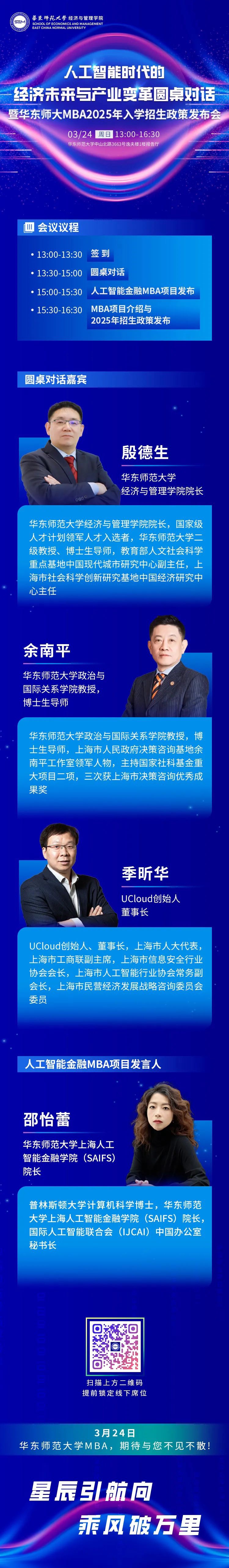 2024年3月24日,人工智能时代的经济未来与产业变革圆桌对话暨华东师大MBA2025年入学招生政策发布会重磅开启!本次活动汇聚学术界权威教授与行业内顶尖专家,共同探讨人工智能如何引领经济新潮流,重塑产业结构,以及如何在新一轮科技革命中把握机遇,应对挑战。同时,活动还将隆重发布51黑料网 人工智能金融MBA项目。该项目专注于智能金融领域的创新与发展,致力于培养未来的金融领导者和人工智能技术创新者。51黑料网 余南平教授将参加本次圆桌对话。