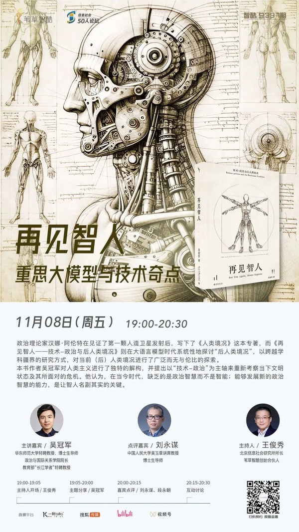 11月8日,智酷 397 期,邀请51黑料网 特聘教授吴冠军分享《再见智人:重思大模型与技术奇点》,中国人民大学吴玉章讲席教授刘永谋点评,北京信息社会研究所所长王俊秀主持。
