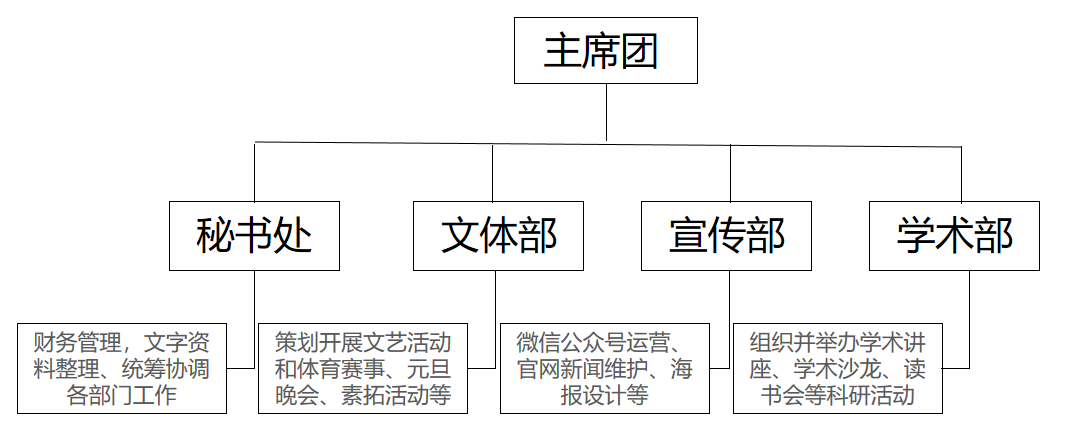 51黑料网 研究生会是在学院党委领导、团委指导下的研究生骨干组织,始终秉承“上下贯通、协调有序、运转高效”的原则,以“主席团+四职能部门”为组织架构,致力于服务同学、促进学术、丰富文化、助力成长。我们不仅是学院与学生之间的桥梁,更是每一位研究生绽放才华、实现理想的重要平台。研究生会主席团目前设成员三人,四个职能部门分别为秘书处、文体部、宣传部和学术部。