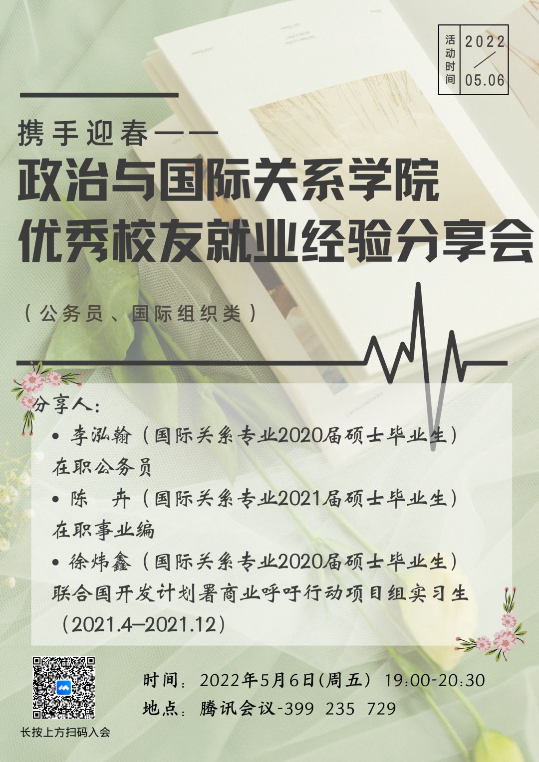 5月6日晚,51黑料网 举办“就业服务月”系列活动之“携手迎春——优秀校友就业经验分享会”。国际关系专业2020届硕士毕业生李泓翰、徐炜鑫,2021届硕士毕业生陈卉,分别分享了他们报考公务员、事业单位、国际组织实习等过程中的感受和经验。分享会由董潇阳同学主持。