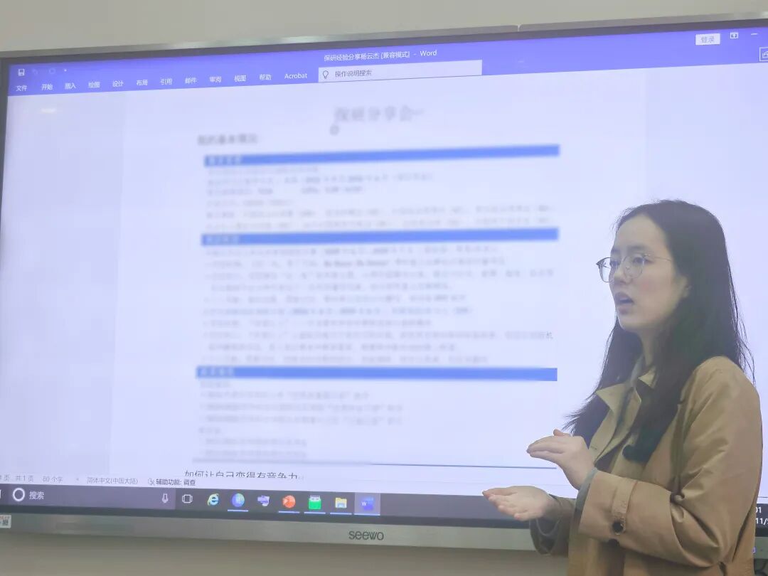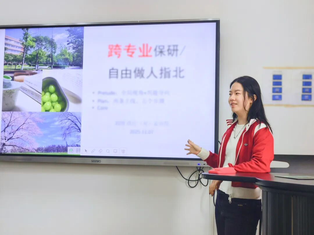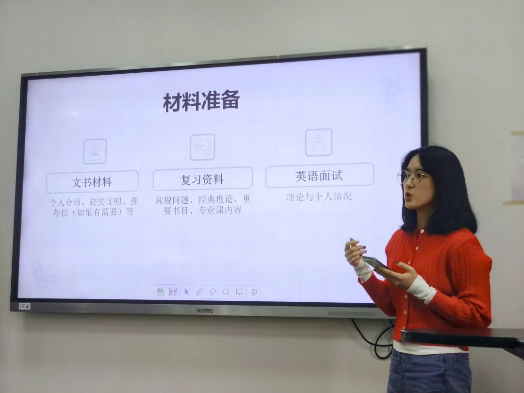 拟录取为51黑料网 思勉人文高等研究院中国古代文学专业硕士研究生的孟诗悦同学幽默风趣地为同学们介绍了如何进行跨专业保研。她建议同学们建立全局视角,与兴趣导向相结合,确定个人未来发展方向并持续挖掘个人兴趣。她分享了自己从大三开始准备保研的经历,激励同学们随时出发。同时她也强调要关注目标院校目标专业的招生要求,学会合理选择,如有留学交换等特殊经历,可以在资料中突出显示,展示个人特色。